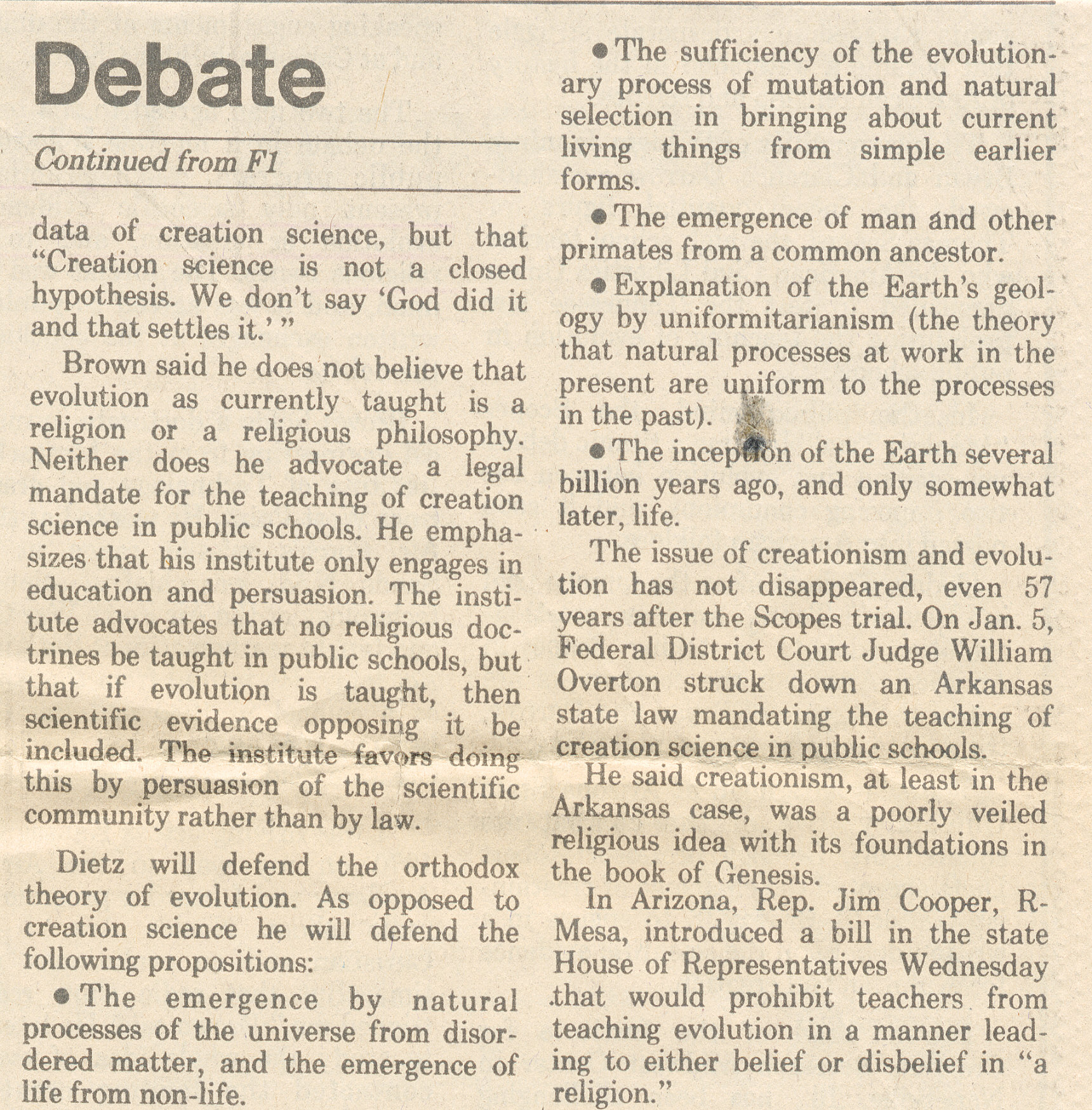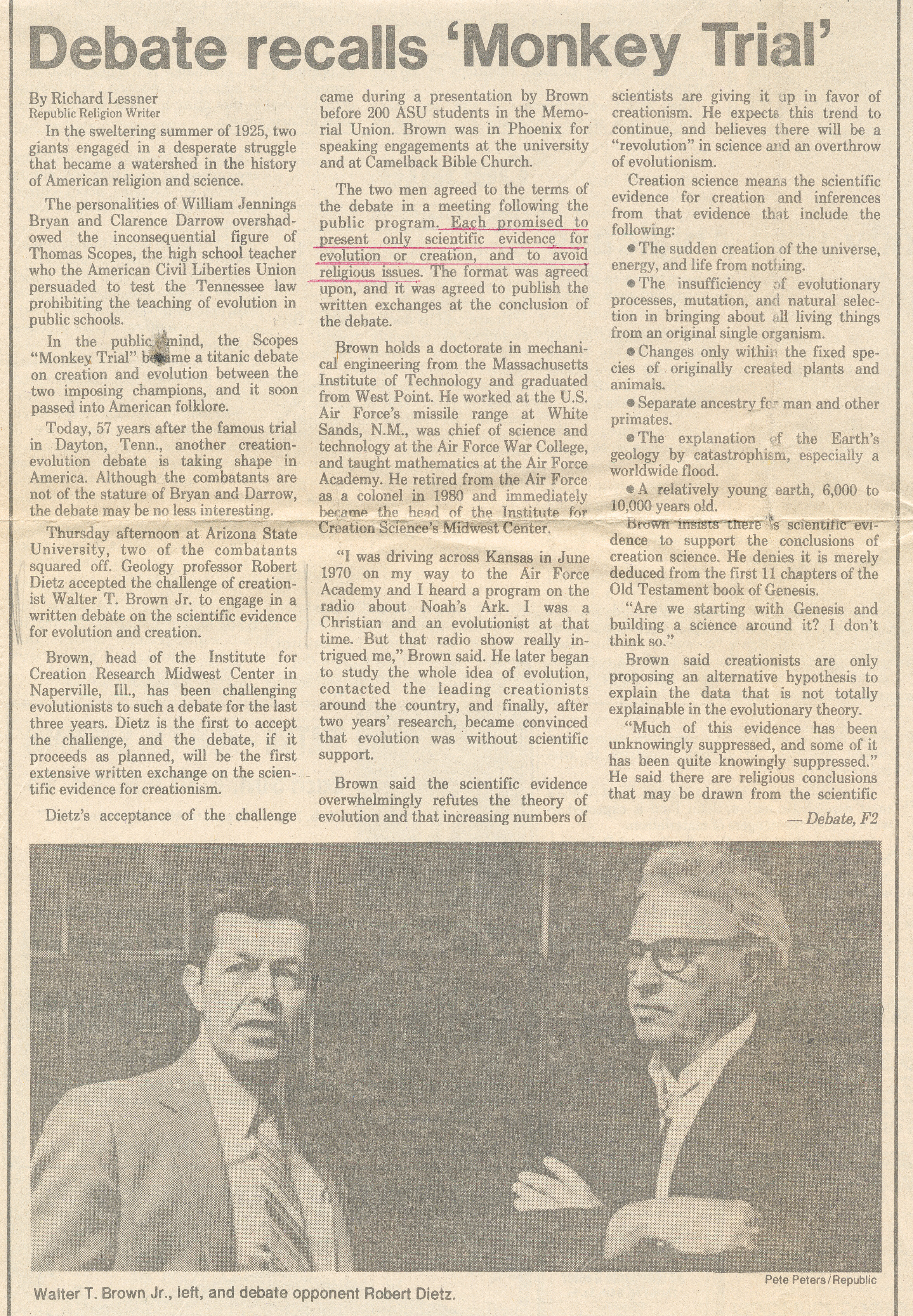 As you can see from my attachments that were published in The Arizona Republic in 1980, I am a creationist living in Phoenix, Arizona, and feel that the creation-evolution controversy will not be resolved until respected advocates on each side of this issue lay out their scientific cases in a formal written debate that is available to the public by allowing both sides to publish it. I consider you four, and any scientists at Arizona State University (ASU) who wish to join you, to be respected advocates for the belief in evolution.