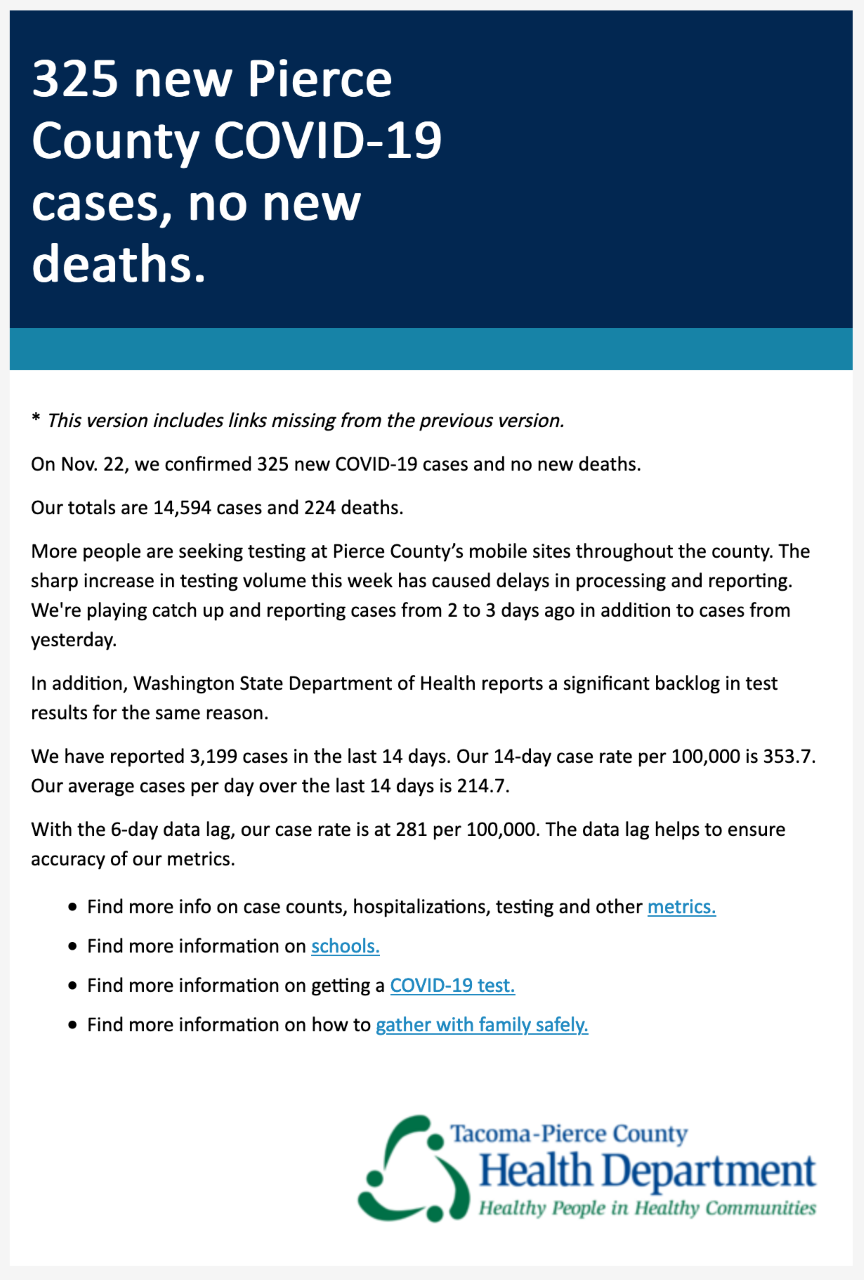 Wow! 325 new Pierce County COVID-19 cases, no new deaths.