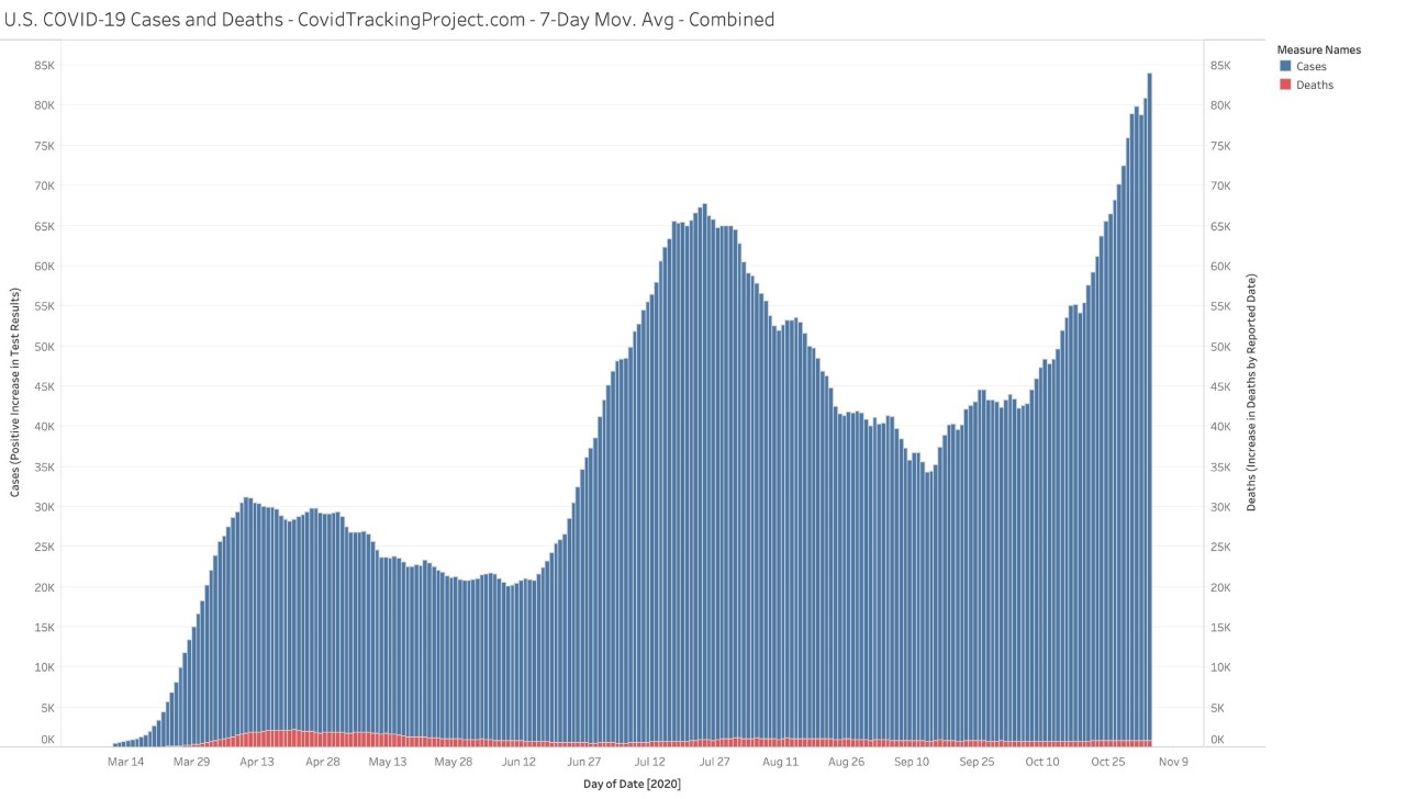 Blue bars represent total cases (positive increases in the results of testing for COVID-19). Red bars represent total deaths attributed to COVID-19. The data represents nine months of reporting from mid-March to the first week of November this year.