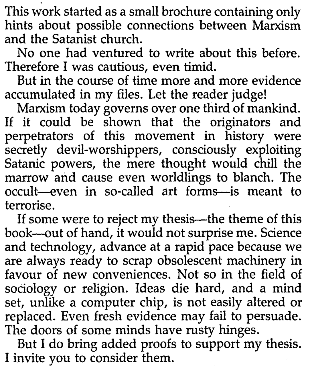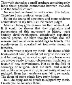 Communism, of course, comes from Marxism. And as Richard Wurmbrand spells out in his must-read book, Marx and Satan, Karl Marx got communism straight from his dealings with the devil. Wurmbrand, a Romanian minister who was imprisoned a total of 14 years under communism, wrote Tortured for Christ and founded Voice of the Martyrs upon his release. In the introduction to Marx and Satan, 5th enlarged edition, Wurmbrand writes:
